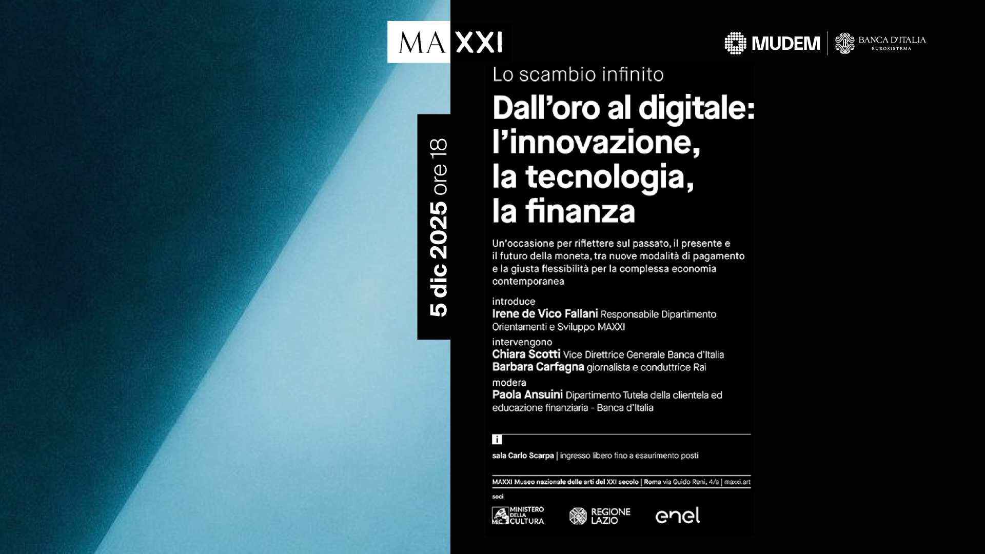 On 5 December, the Carlo Scarpa room at the MAXXI is hosting the final meeting of the cycle, with an event called 'From gold to the digital euro: innovation, technology and finance', which is an opportunity to reflect on the past, present and future of money, together with Chiara Scotti, Deputy Governor of Banca d'Italia, and Barbara Carfagna, journalist and RAI tv presenter.